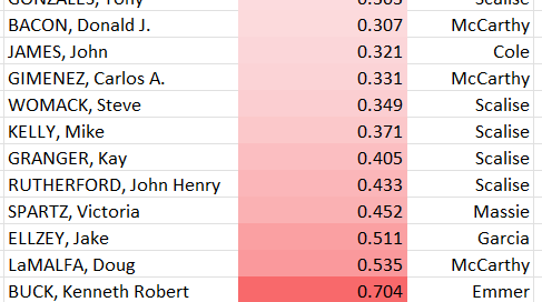 To get a reading on who, of Zeldin and the others, might be the most amenable to a working bipartisan speakership, I turned to the data at Voteview. Voteview is a database that has analyzed the voting records of members of Congress and classified them along an ideology metric from liberal to conservative based on their voting records in the current Congress. I’ve color-coded it. The scale goes from -1 as pure liberal to 1 as pure conservative.